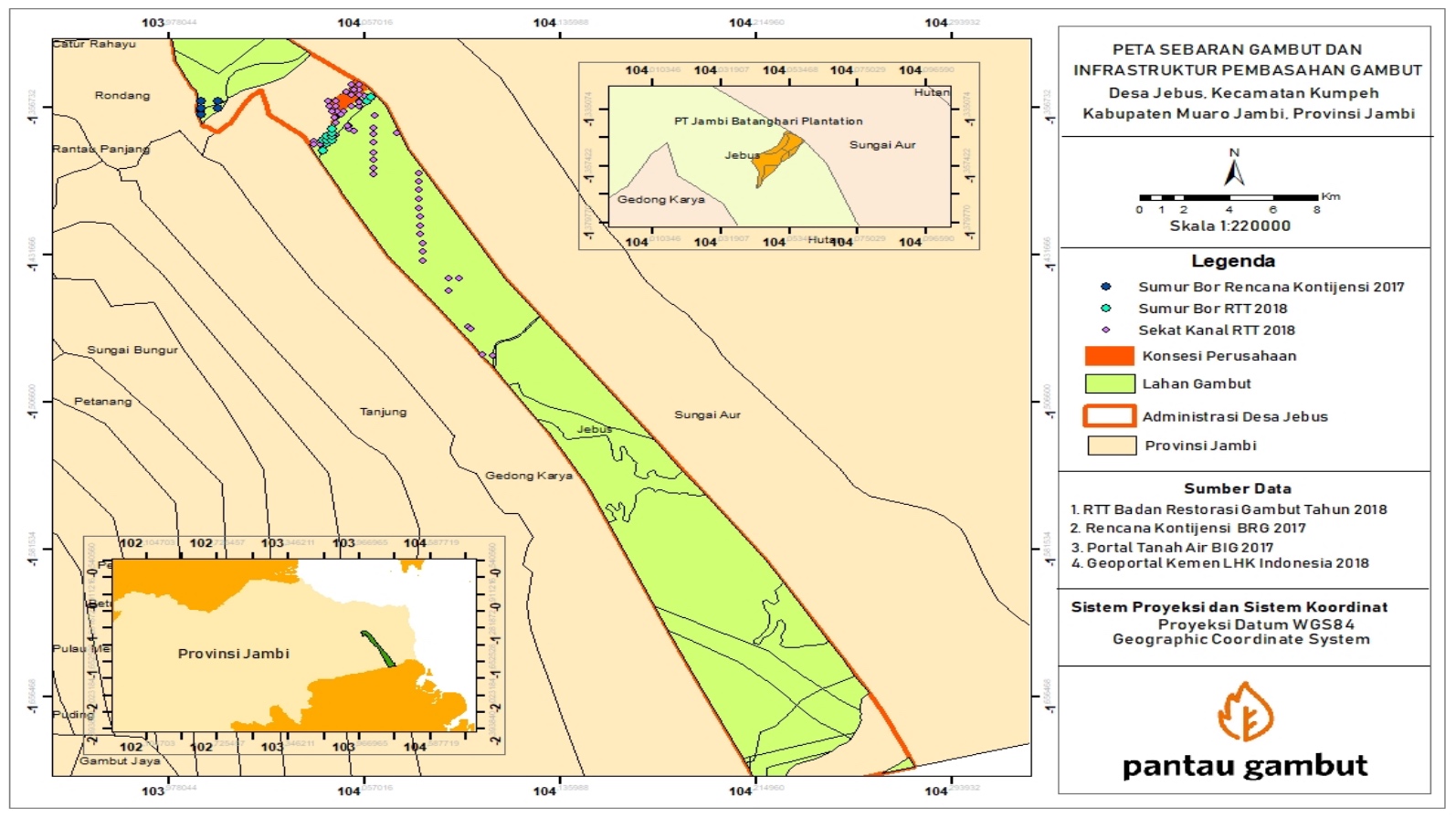 Desa Jebus yang secara administrasi masuk wilayah Kecamatan Kumpeh Ilir, Muaro Jambi, berada di wilayah dua Kesatuan Hidrologis Gambut (KHG), yaitu KHG Sungai Batang Hari - Sungai Air Hitam Laut dan KHG Sungai Mendahara - Sungai Batanghari. Sebagian besar wilayah Jebus adalah gambut yang luasnya mencapai 116.028 hektar. Kedua KHG ini termasuk dalam program prioritas restorasi 2 juta hektar lahan gambut.