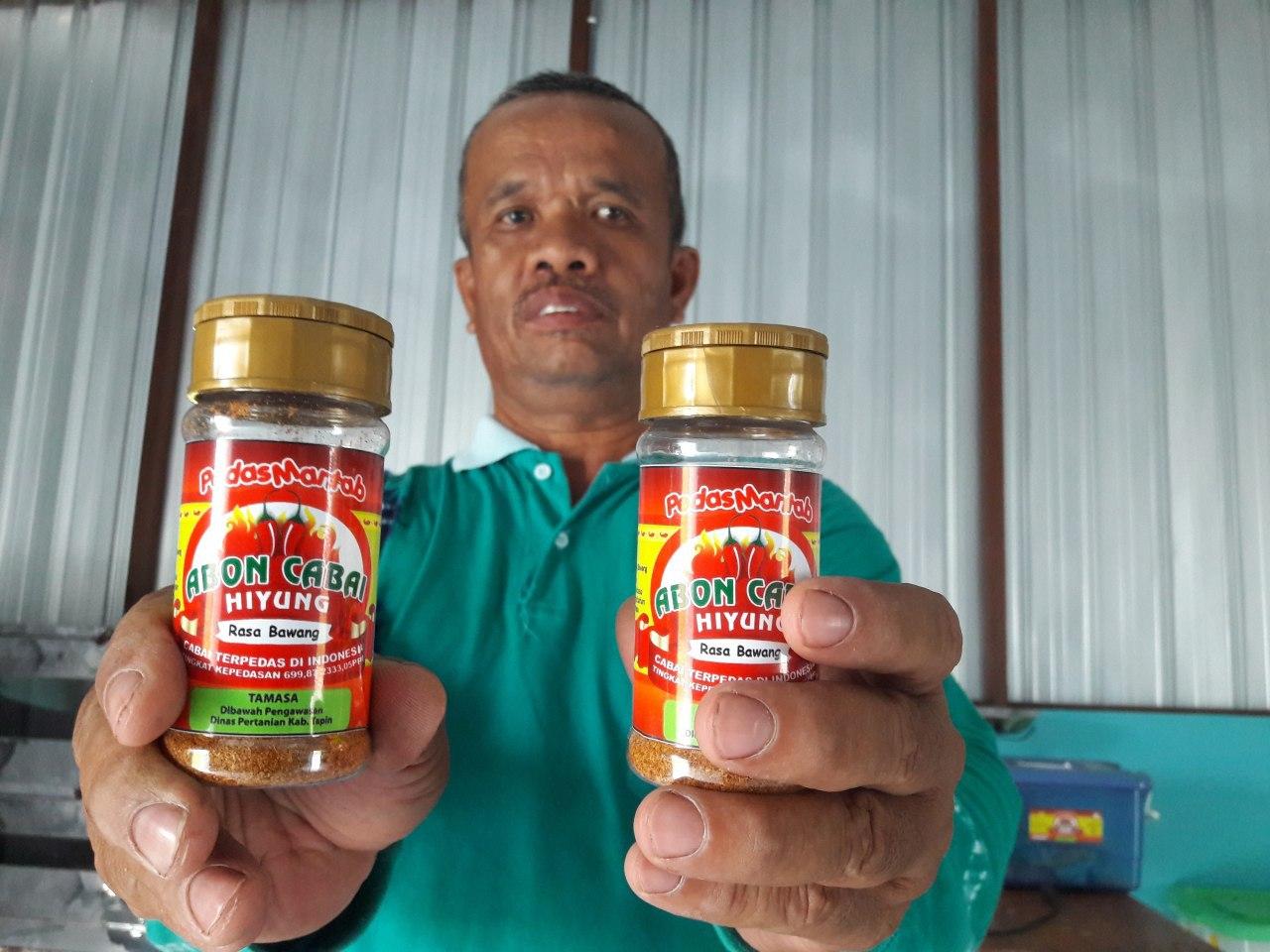 Untuk memaksimalkan penjualan cabai, Junaidi juga bercerita para petani di Hiyung mulai mengembangkan sektor hilir cabai basah berupa abon cabe lokal. Satu botol abon dilego dengan harga Rp. 15.000,-