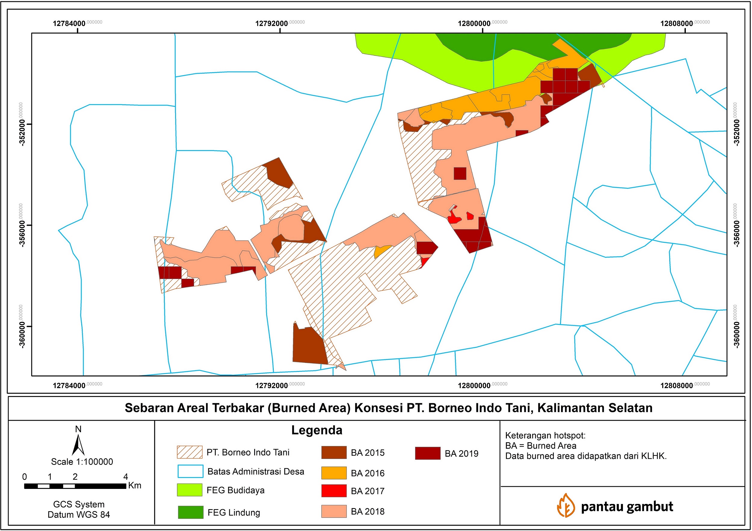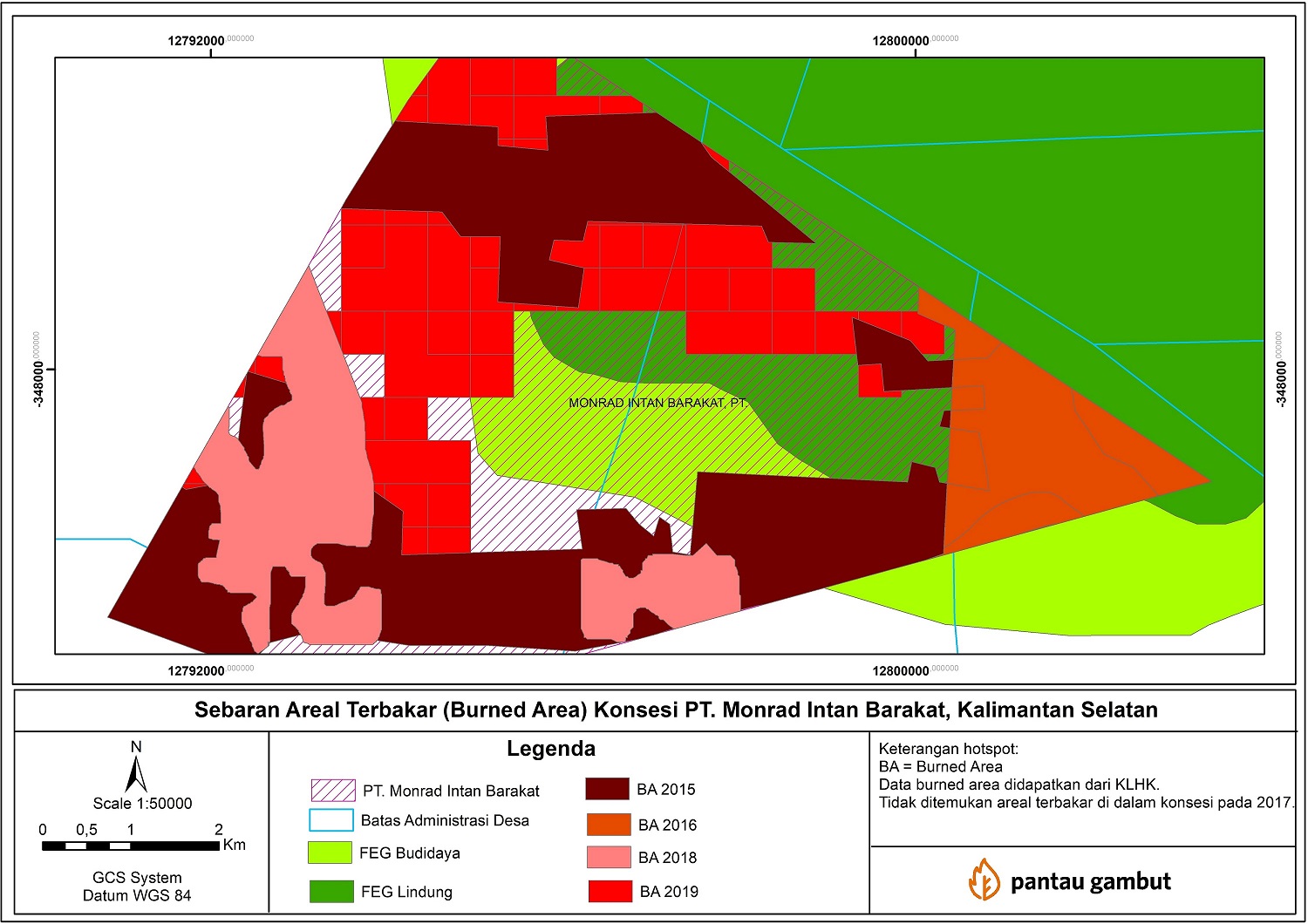 Hasil Analisa Pantau Gambut terhadap area bekas terbakar (burned area) di dalam wilayah kerja dua konsesi tersebut memperlihatkan banyaknya bekas area terbakar dari tahun 2015 – 2019.
